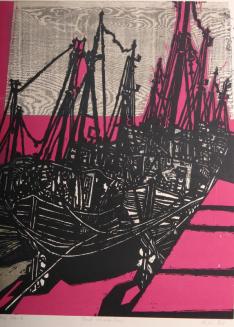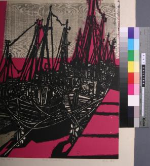 Descriptionboats docked along the quay, one large image in foreground and smaller ones behind, the sea and dock are coloured with a bright pinkStatus
