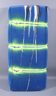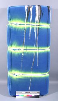 DescriptionBlue velvet cushion has been folded, tied with rope, and painted with yellow.