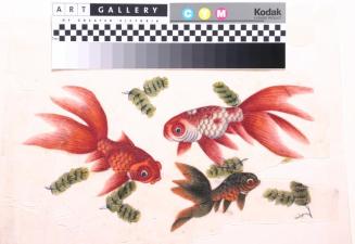 DescriptionPainting of three goldfish done in red, orange, white and black with segments of floating plants.Colour: red;orange;white;black;green