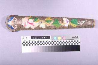 DescriptionElongated case with opening at one end. Light grey coloured silk is embroidered with short black lines in a grid-like pattern. Pink, blue , purple and white flowers with stems and leaves in greens are appliqued over this. Red base and black liningColour: grey;pink;blue;purple;white;red;black