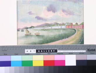 DescriptionHarbour scene with a row of red and white buildings along shore. Sailing vessels and small boats on water, people on shoreStatus