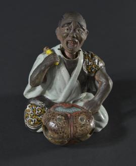 DescriptionHollow figurine of a seated man chanting with mouth open and a drum at his feet and percussion instrument in his R hand proper. Head is a separate unit that rests in the neck hole on metal pins to allow nodding, and with a weight at the bottom.Colour: brown;green;yellow