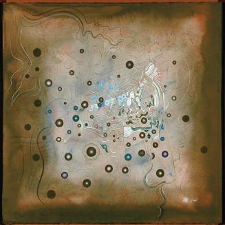 Descriptionseries of spheres and brush strokes in dark browns, purples, blues, teal and pastelsStatus