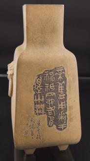 DescriptionRoughly rectangular vase with angular shoulders and a rectangular neck, sits on four four-sided tapered feet. Ring handles and their attachments have been carved/applied to two opposing sides of the body. One side of the body has carved and incised calligraphy and the opposing side has an incised image of a man seated in a garden?, and calligraphy.Status