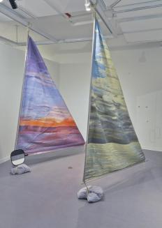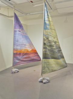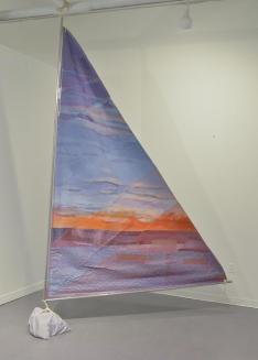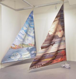 Descriptiontriangular sail is a patchwork of fabrics enclosed within nylon mesh. One side is abstract with fabrics in shades of pink, orange, blue and purple while the other is predominantly in blue but with inclusions of souvenir penants and an embroidered scene; hollow aluminum poles at 2 sides within a plastic gusset; ropes threaded through the poles;Status