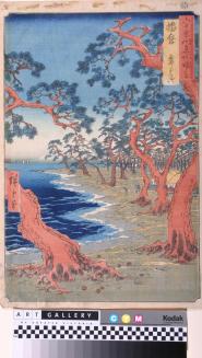 DescriptionImage of pine trees with gnarled roots on a beach. Building and figures in background.Status