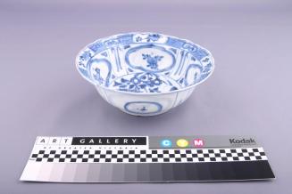 DescriptionThin walled bowl has a flared rim with delicately scalloped edge and a small straight foot. It is decorated with blue underglaze geometric and floral design with flowers at centre interior.Status