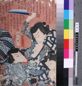 DescriptionAngry tattooed man with knife raised in right hand proper holds a man beneath him. Woman's face in right hand corner. Red upper background covered with Japanese characters.Status