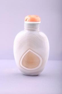 DescriptionBottle is a roughly flattened ovoid shape with a narrow base and a short straight neck. Agate body is white and beige and stopper is rounded orange carnelian with a disc of white stone at its base.Colour: beige;white;orange