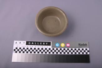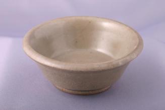 DescriptionSmall bowl has straight tapering sides, curved lip at rim and a small foot. It is glazed with dark celadon, except for the foot and the base.Status