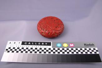 DescriptionLid and bottom of round covered box of carved red lacquer have indentical decoration of large peony surrounded by deeply carved leaves on yellow ground. Interior is blackColour: red;black
