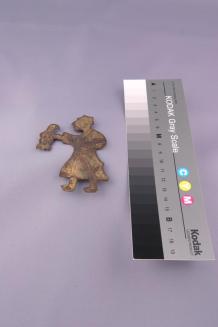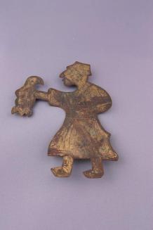 DescriptionPlaque is incised and gilded on one surface, depicting a male falconer wearing a truncated cone shaped hat with an outstretched arm holding a falcon. One of a pairStatus