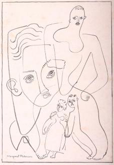 DescriptionBlack and white ink drawing portrays a large figure of a man and the face of a woman in the background at the top. Two smaller figures of a man and a woman in the foreground.Colour: black;white