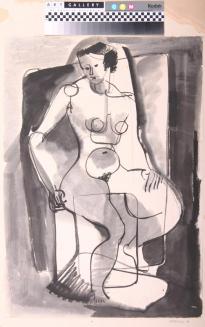 DescriptionBlack and white ink drawing with washes portrays a seated female nudeColour: black;white