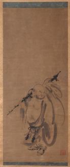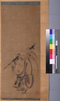 DescriptionDepiction of a bald-headed, ear ringed man wearing a robe that exposes his large belly. He carries a stick with a bag. Painted with gray and black ink on dark coloured paperColour: black, grey