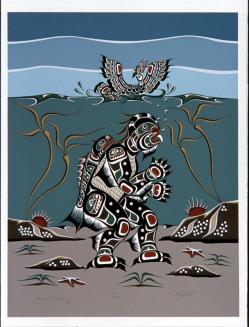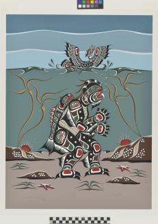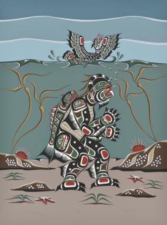 DescriptionDepiction of a creature walking underwater. There is a sea bird landing on the surface of the water above. colours are in shades of blue, green and brown with red, black and greenColour: blue, green, brown, red, black, green