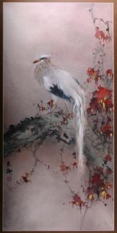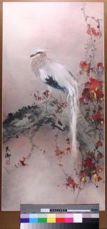 DescriptionWhite peacock seated on a branch with autumn foliage.Status