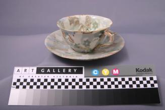 Descriptioncup and saucer made from marbled clay in a tapestry pattern in beige, blue, green and white. There is gold on rims and handle and interior of cup is glazed with clear glaze.Colour: beige;green;blue;white;gold