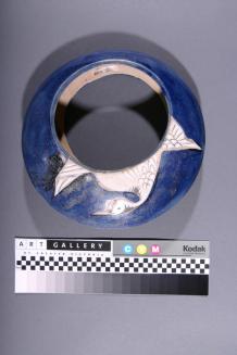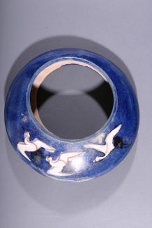 DescriptionMoon shaped hanging vase in grey ceramic with enamel colours. Crane on front and three au versoStatus