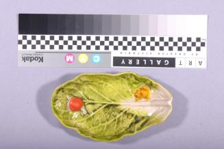 DescriptionDish in shape of a curled up lettuce leaf with prominent veins and with a red snail and a yellow frog inside.Colour: green;red;yellow
