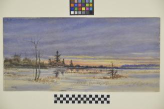 DescriptionLandscape with marsh and birds and trees with a sunset or sunrise on horizon.Status