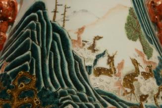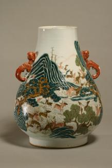 Description'Hu" shaped vase, famille rose with deer scattered in a rocky pine landscape with other foliage, including peach and lingzhi and painted on a pale celadon ground. The neck has gilt iron red dragon handles.Status
