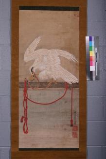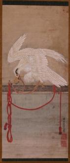 DescriptionPainting depicts a white tethered hawk on a horizontal perch biting on a cord attached to his leg. Red cords with tassels hang in knots and loops from the perch.Status