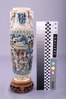 DescriptionOne of a pair of tall, narrow, lidded, vases, ornately carved in relief and sunken relief, with scenes of figures, architecture and landscape elements. Painted in tones of blue, brown and green. There is a fu dog on the top of each lid and a mask with a loose ring on each neck.Colour: blue;brown;green