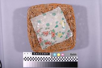 Descriptionbasket shaped dish; square, grey ceramic with enamel colours; flowers and geometric design on servietteStatus