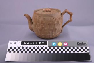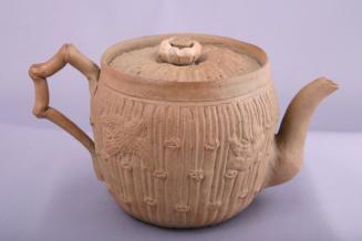 DescriptionSmall light brown teapot, the exterior of which has an overall relief pattern of bamboo with bird motifs, on exterior and lid. Handle is bamboo shaped and knob has a centre post with a separate moveable ring.Colour: light brown