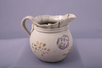 DescriptionGrey jug with coiled details around the top and including the handle. Top edge is crimped and outlined in gold. Floral motifs on sides in gold and some mauve white and beige.Colour: grey;details in gold;mauve;white;beige