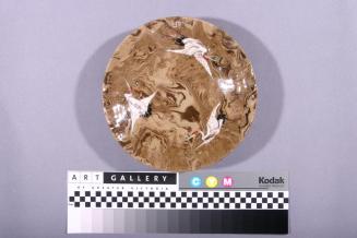 DescriptionShallow circular dish with asymetrical height and brown marbled pattern in the clay and with three enamelled cranes on interior in white, black and redColour: brown;white;black;red