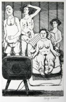 DescriptionFrom a portfolio of 12 etchings entitled Summer Shadows, Summer Dreams; A nude woman lying in a deck chair, a small child standing behind her, two men standing, one in underwear and the other in clothes, all facing a television with a wall behind them.Colour: black; white