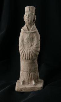 DescriptionFigurine of a standing court official wearing a robe and a cylindrical hat and with his hands clasped together within sleeves at front.Status