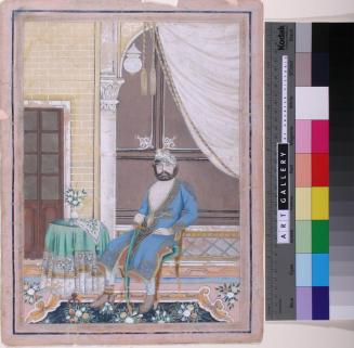 DescriptionPortrait of a seated male figure (Sikh ruler) in long blue coat, turban on head, mustache and beard, and long sword in hand. Surroundings include a door, floral carpet, table with cloth and vase, large opening (window?) with a column and tasselled curtain.Status