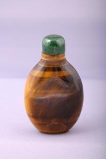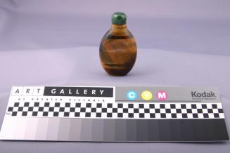 DescriptionBottle is a flattened ovoid with a tapered neck and small footed base. Stopper is polished green jade in a cylindrical shape with a rounded top.Colour: brownish;green