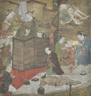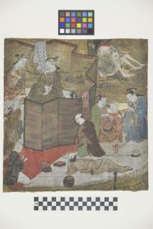 DescriptionMale figures and geishas in the interior of a geisha house.Colour: multi-coloured