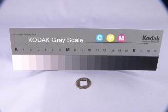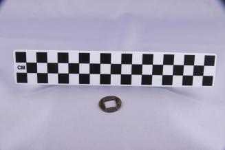 DescriptionCircular coin with square cut out at centre and raised characters on one side.Status