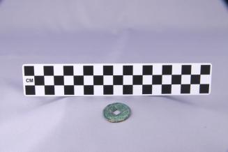 DescriptionCircular coin with square cut out at centre and raised characters on one side.Status