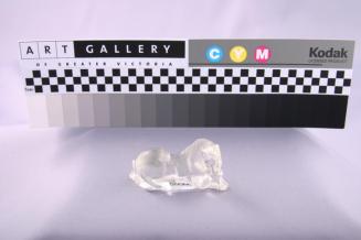 DescriptionClear glass recumbent horse figure with muzzle on front foreleg and head to one side.Status