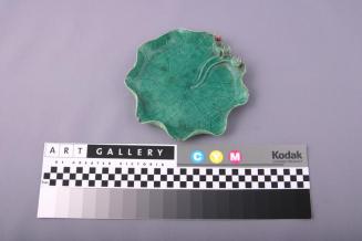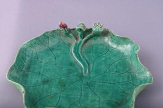 Descriptionroughly round lotus leaf shaped dish has an upturned and curled edge, incised veins on 2 sides and a stem with buds on top. Darker green on inside, lighter on outside. One bud is purple.Status