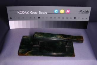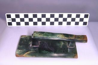 DescriptionRectangular slab with raised handle at centre on one side and overhanging at one end. Edges on adjacent sides of the blade along the length are bevelled and 2 end edges are straight. One corner is bevelled.Status