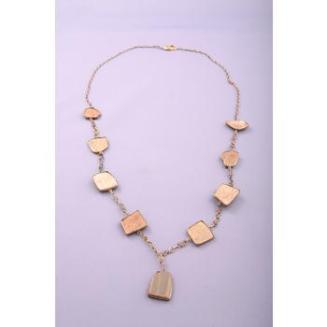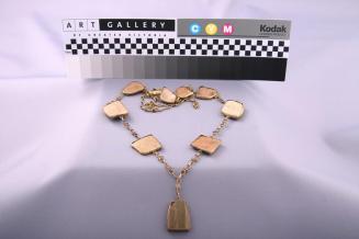 DescriptionEight pieces of oracle bone and one piece of stone joined together with a delicate chain with a neck clasp. Each piece of bone or stone has a metal collar. Bone has incised partial inscriptionsStatus