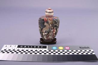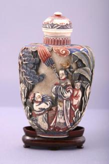 DescriptionBottle has squarish shoulders tapering to the base with a very small foot. It is decorated with a carved, painted and incised relief of courtiers. The stopper is decorated in a similar style with a smaller knob at top.Status