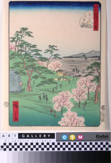 DescriptionPark like scene with people and a large stone monument and cherry trees in blossom.Colour: multi-coloured