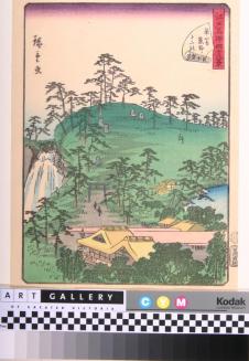 DescriptionHill with arch, monuments, trees and waterfall, and with building in foregroundColour: multi-colour