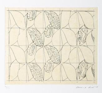 DescriptionA line drawing of a grid with leaf-like patterns, seahorses etc on chine-collÚ background of cream coloured paperColour: black; cream