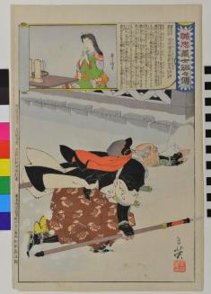 DescriptionDepiction of Kanamaru running in the snow with a lance in his hand. Picture of woman inset at TL. Embossed texture on parts of robe, TL section and snow. Horibe Yahei MinamotoColour: multi-coloured