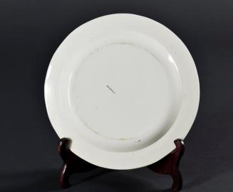 Descriptioncircular white dinner plate has a plain flat raised rim in yellow bordered with thin black lines; black transfer print illustration in the well depicts a landscape view of Lustal, SwitzerlandStatus