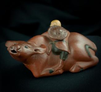 DescriptionWater dropper is in the shape of a water buffalo lying down with it's head raised while a boy with a tool in his right hand proper, leans over it's back. There is a perforation in the buffalo's mouth.Status